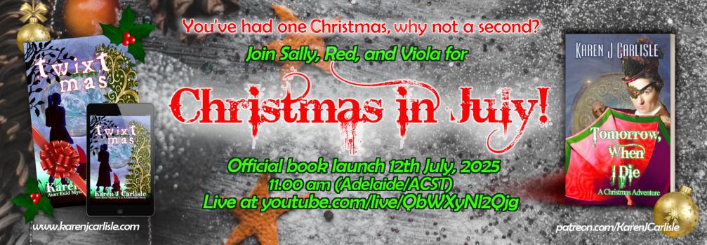 - 12th July – Christmas in July online booklaunch (Twixtmas and Tomorrow, When I Die). 11.00am* – 12.30pm (Adelaide time/ACST): eBook copies of both books (worldwide) and a paperback copy of Tomorrow, When I Die were available. Replay available HERE (Note: giveaways mentioned no longer apply after the event)