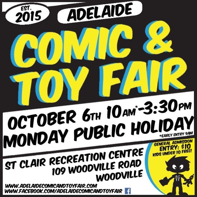 - 19th April: Cancelled due to Covid-19 event restrictions now in Australia. (rescheduled to 5th Oct) Adelaide Comic and Toy Fair.