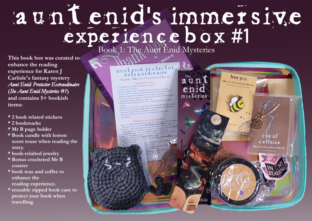 The ‘Immersive Experience’ Box Aunt Enid #1 was prepared to enhance the reading experience for Aunt Enid: Protector Extraordinaire, book 1 in The Aunt Enid Mysteries.